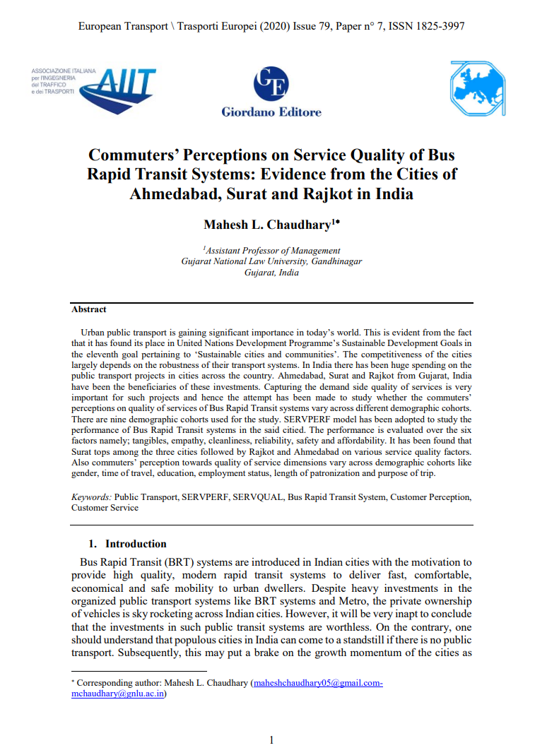 Citation: Chaudhary, M. L. (2020). Commuters’ perceptions on service quality of bus rapid transit systems: Evidence from the cities of Ahmedabad, Surat and Rajkot in India. Eur. Transp.-Trasp. Eur, 79. https://doi.org/10.48295/ET.2020.79.7