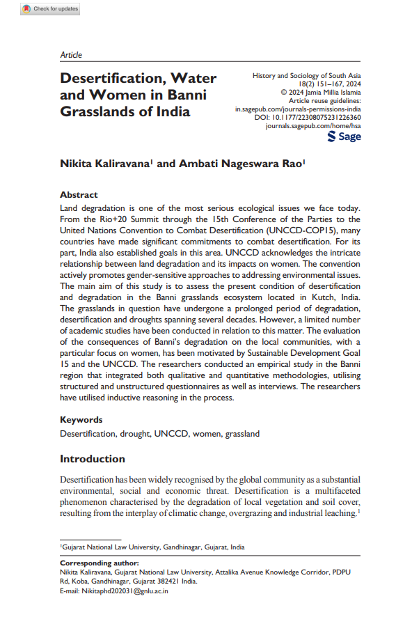 Citation: | Kaliravana, N., & Rao, A. N. (2024). Desertification, Water and Women in Banni Grasslands of India. History and Sociology of South Asia, 18(2), 151-167. https://doi.org/10.1177/22308075231226360 (Original work published 2024) |