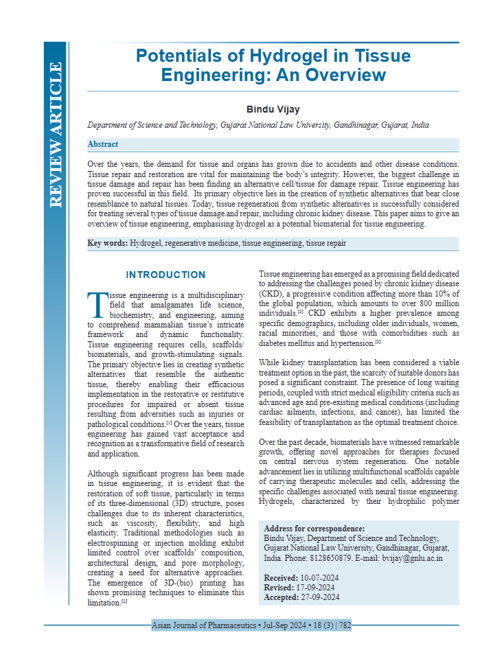 Citation: | Vijay, B. (2024). Potentials of Hydrogel in Tissue Engineering: An Overview. Asian Journal of Pharmaceutics (AJP), 18(3). |
