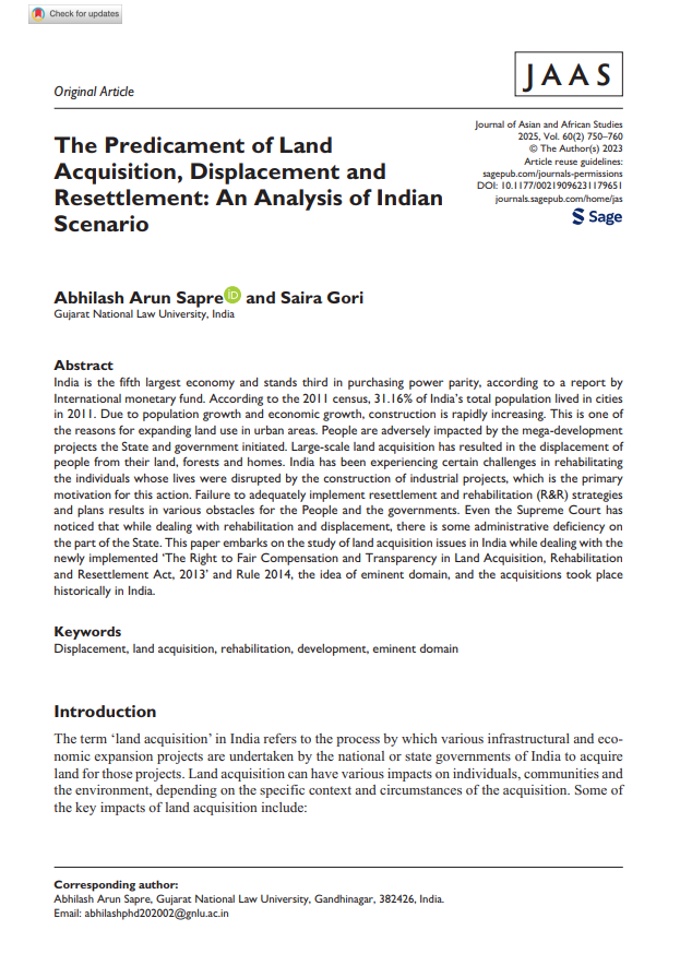 Citation: Sapre, A. A., & Gori, S. (2023). The Predicament of Land Acquisition, Displacement and Resettlement: An Analysis of Indian Scenario. Journal of Asian and African Studies, 60(2), 750-760. https://doi.org/10.1177/00219096231179651 (Original work published 2025)