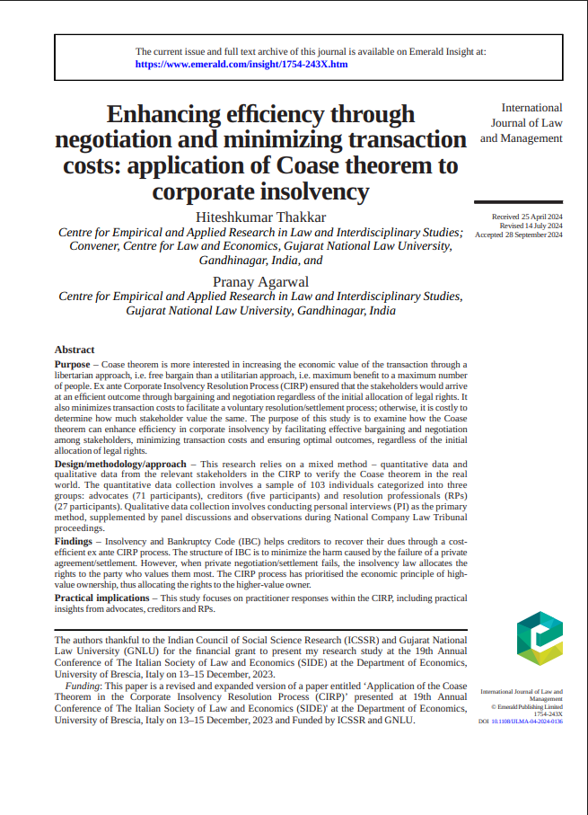 Citation: | Thakkar, H. and Agarwal, P. (2024), "Enhancing efficiency through negotiation and minimizing transaction costs: application of Coase theorem to corporate insolvency", International Journal of Law and Management,. https://doi.org/10.1108/IJLMA-04-2024-0136 |