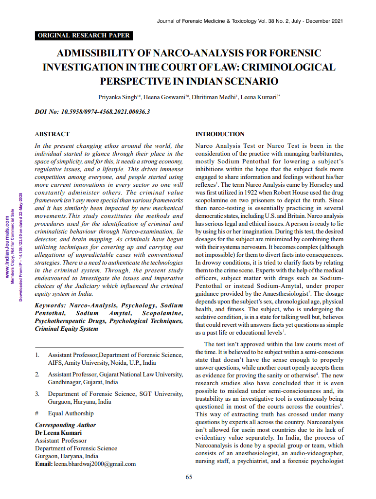 Citation: Singh, P., Goswami, H., Medhi, D., & Kumari, L. (2021). Admissibility of narco-analysis for forensic investigation in the court of law: Criminological perspective in Indian scenario. Journal of Forensic Medicine and Toxicology, 38(2), 65–69. https://doi.org/10.5958/0974-4568.2021.00036.3
