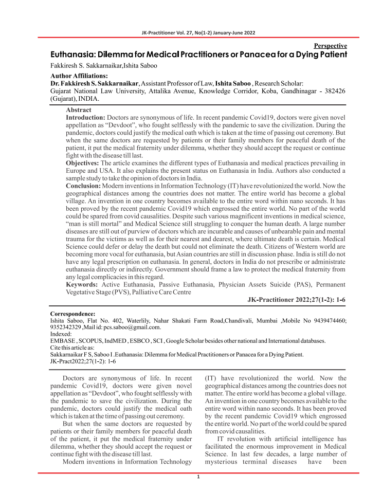 Citation: | Sakkamaikar, F. S.; Saboo, I. Euthanasia: Dilemma for Medical Practitioners or Panacea for a Dying Patient. JK Practitioner, V. 27, N. 1/2, p. 1–6, 2022. Disponível em: https://search.ebscohost.com/login.aspx?direct=true&db=asx&AN=159989008&site=eds-live. Acesso em: 18 mar. 2025. |