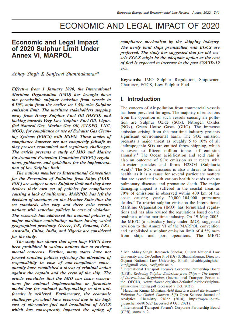 Citation: | Singh, A., & Shanthakumar, S. (2022a). Economic and legal impact of 2020 sulphur Limit under Annex VI, MARPOL. European Energy and Environmental Law Review, 31(Issue 4), 241–257. https://doi.org/10.54648/eelr2022017 |