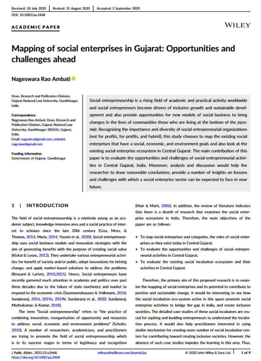Citation: Ambati NR. Mapping of social enterprises in Gujarat: Opportunities and challenges ahead. J Public Affairs. 2022; 22:e2468. https://doi.org/10.1002/pa.2468