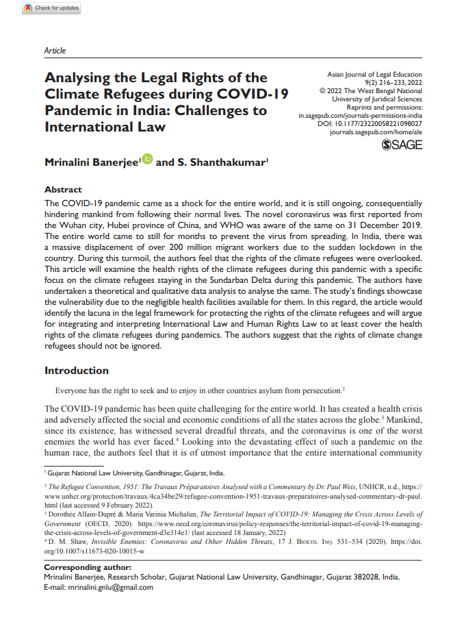 Citation: Banerjee, M., & Shanthakumar, S. (2022). Analysing the Legal Rights of the Climate Refugees during COVID-19 Pandemic in India: Challenges to International Law. Asian Journal of Legal Education, 9(2), 216-233. https://doi.org/10.1177/23220058221098027 (Original work published 2022)