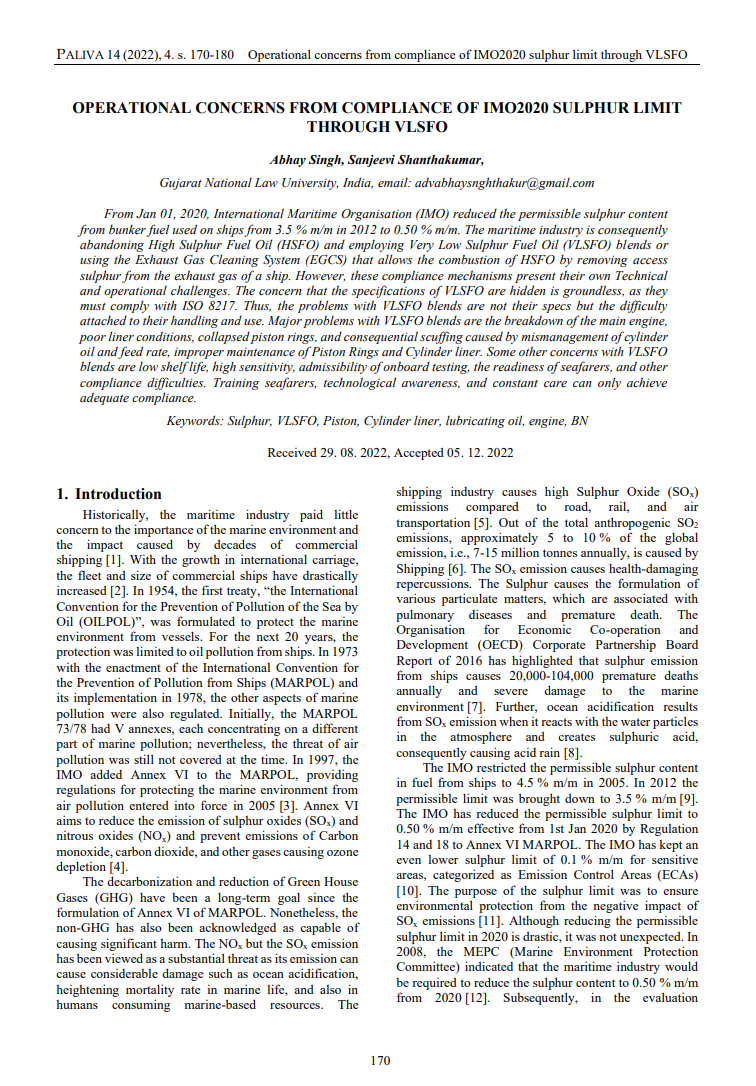 Citation: Singh, A., & Shanthakumar, S. (2022). Operational concerns from compliance of IMO2020 sulphur limit through VLSFO. Paliva, 170–180. https://doi.org/10.35933/paliva.2022.04.02