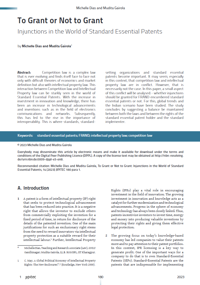 Citation: Dias, M., & Mudita, G. (2023). To grant or not to grant: Injunctions in the world of standard essential patents. Journal of Intellectual Property, Information Technology and E-Commerce Law (JIPITEC), 14(1), 180–189. https://www.jipitec.eu/jipitec/article/view/373