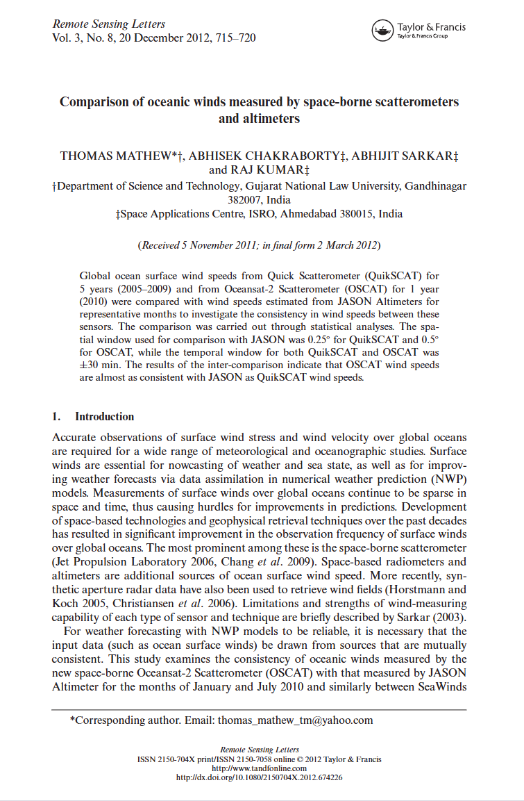 Citation: | Mathew, T., Chakraborty, A., Sarkar, A., & Kumar, R. (2012). Comparison of oceanic winds measured by space-borne scatterometers and altimeters. Remote Sensing Letters, 3(8), 715–720. https://doi.org/10.1080/2150704x.2012.674226 |