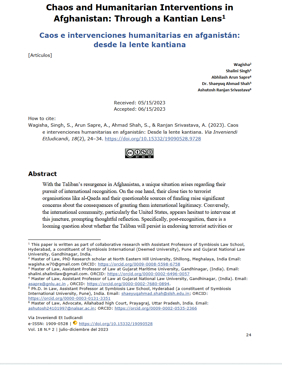 Citation: | Wagisha, N., Singh, S., Sapre, A. A., Shah, S. A., & Srivastava, A. R. (2023). Chaos and humanitarian interventions in Afghanistan. Via Inveniendi Et Iudicandi, 18(2), 24–34. https://doi.org/10.15332/19090528.9728 |