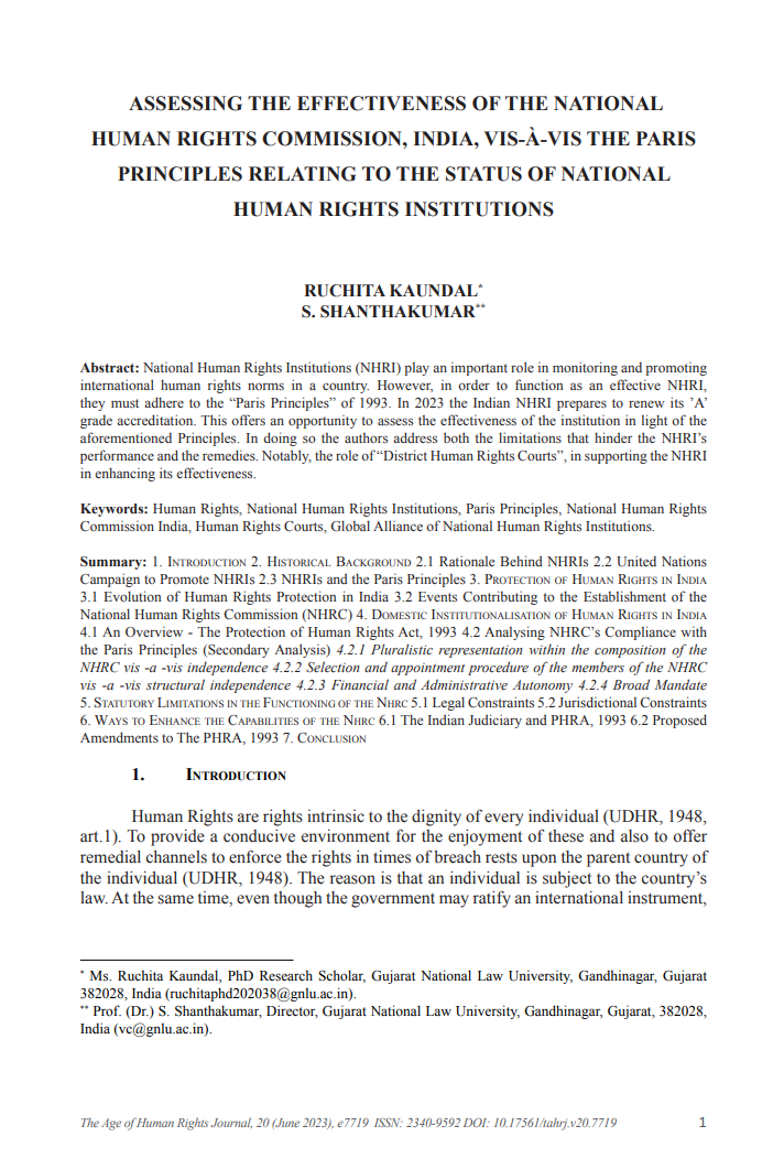 Title: | Assessing the Effectiveness of the National Human Rights Commission, India, vis-à-vis the Paris Principles Relating to the Status of National Human Rights Institutions |