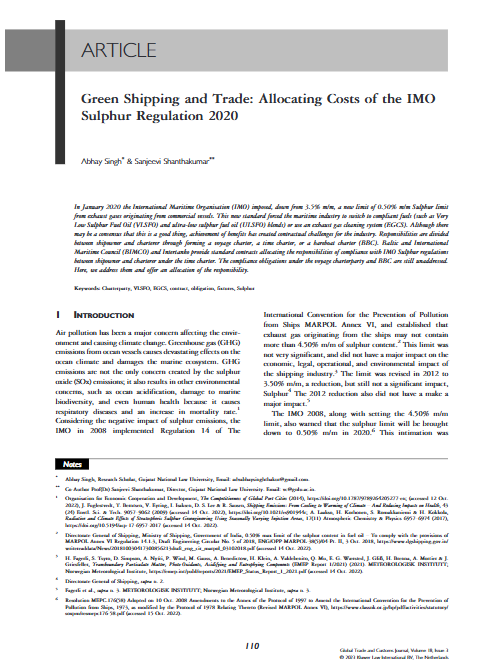 Citation: | Singh, A., & Shanthakumar, S. (2023). Article: Green Shipping and Trade: Allocating costs of the IMO Sulphur Regulation 2020. Global Trade and Customs Journal, 18(Issue 3), 110–119. https://doi.org/10.54648/gtcj2023012 |