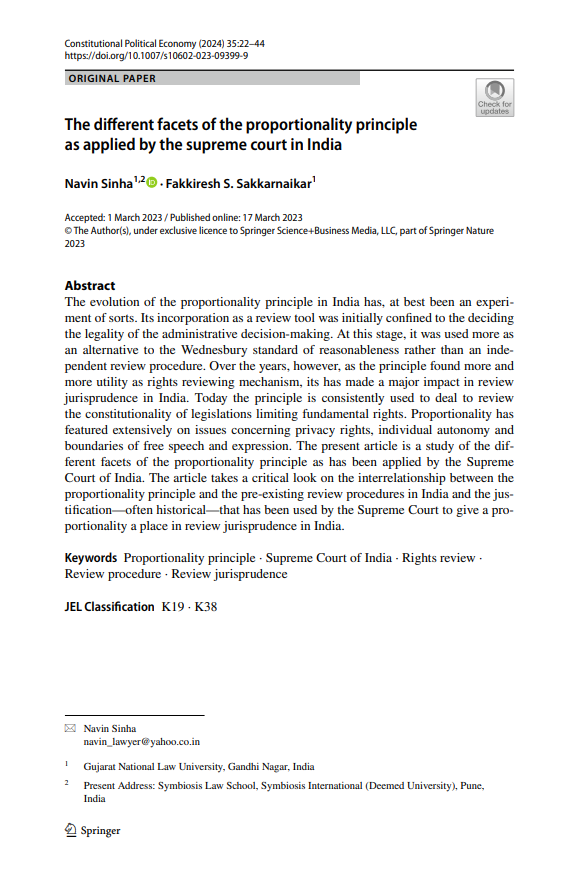 Citation: | Sinha, N., & Sakkarnaikar, F. S. (2023). The different facets of the proportionality principle as applied by the supreme court in India. Constitutional Political Economy, 35(1), 22–44. https://doi.org/10.1007/s10602-023-09399-9 |