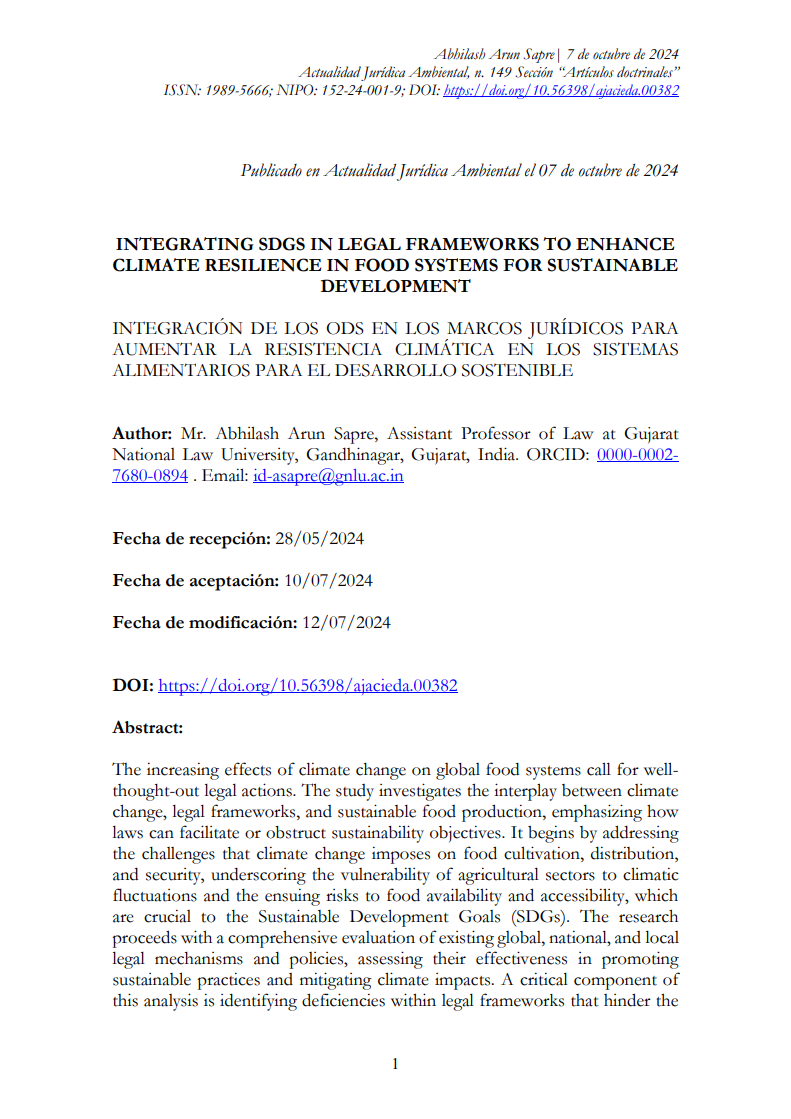 Citation: | Sapre, A. A. (2024). Integrating SDGS in legal frameworks to enhance climate resilience in food systems for sustainable development. Actualidad Jurídica Ambiental, 1–28. https://doi.org/10.56398/ajacieda.00382 |