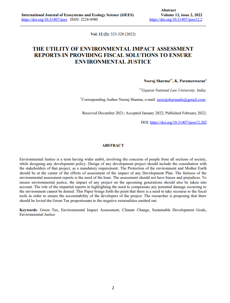Citation: Sharma, N., & Parameswaran, K. (2022). The utility of environmental impact assessment reports in providing fiscal solutions to ensure environmental justice. International Journal of Ecosystems & Ecology Sciences, 12(2). https://doi.org/10.31407/ijees12.202