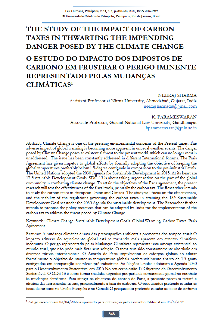 Citation: Sharma, N., & Parameswaran, K. (2022). The study of impact of carbon taxes in thwarting the impending danger posed by the climate change. Lex Humana (ISSN 2175-0947), 14(1), 348-357. https://seer.ucp.br/seer/index.php/LexHumana/article/view/2226