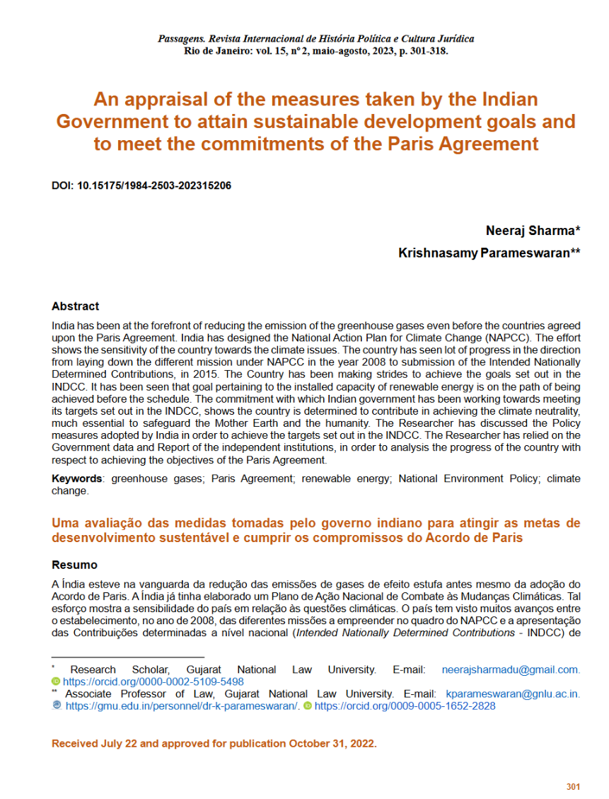 Citation: Sharma, N., & Parameswaran, K. (2023). An appraisal of the measures taken by the Indian Government to attain sustainable development goals and to meet the commitments of the Paris Agreement. Passagens: Revista Internacional De História Política E Cultura Jurídica, 15(2), 301-318. https://doi.org/10.15175/1984-2503-202315206