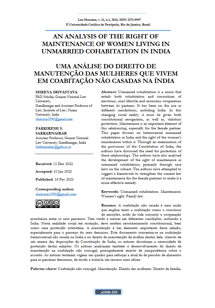 Citation: | Srivastava, S., & Sakkarnaikar, F. S. (2023). An analysis of the right of maintenance of women living in unmarried cohabitation in India. Lex Humana (ISSN 2175-0947), 15(1), 324-338. |